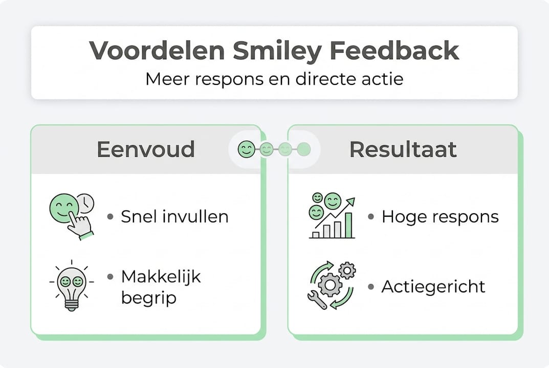 - Verdieping via open tekst: na de smiley kan de respondent optioneel een korte toelichting typen, het 'waarom' achter de score.
